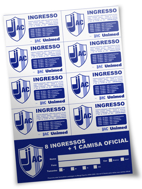 Na próxima semana, a barraca do JAC estará montada na Praça Adolfo Konder (em frente à Prefeitura Municipal). O pacote de ingressos também estará à venda na bilheteria do Oscar Rodrigues da Nova, na próxima quarta-feira durante o jogo contra o Camboriuense, marcado para as 20h30min.