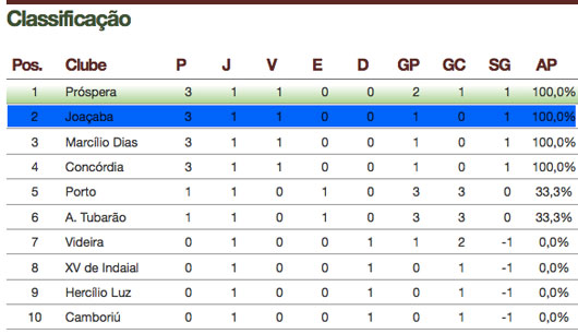 Terminados os jogos da primeira rodada, você acompanha aqui no Blog a tabela de classificação, liderada pelo Próspera. O Time da Raça venceu pela mesma diferença que o JAC, porém, marcou dois gols. Um mísero golzinho (que o JAC não fez jogando com dois atletas a mais em campo) fez a diferença nesta primeira rodada.